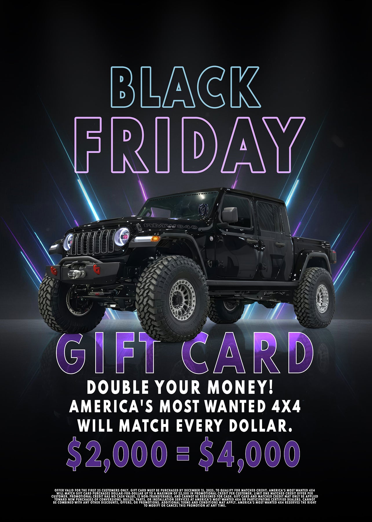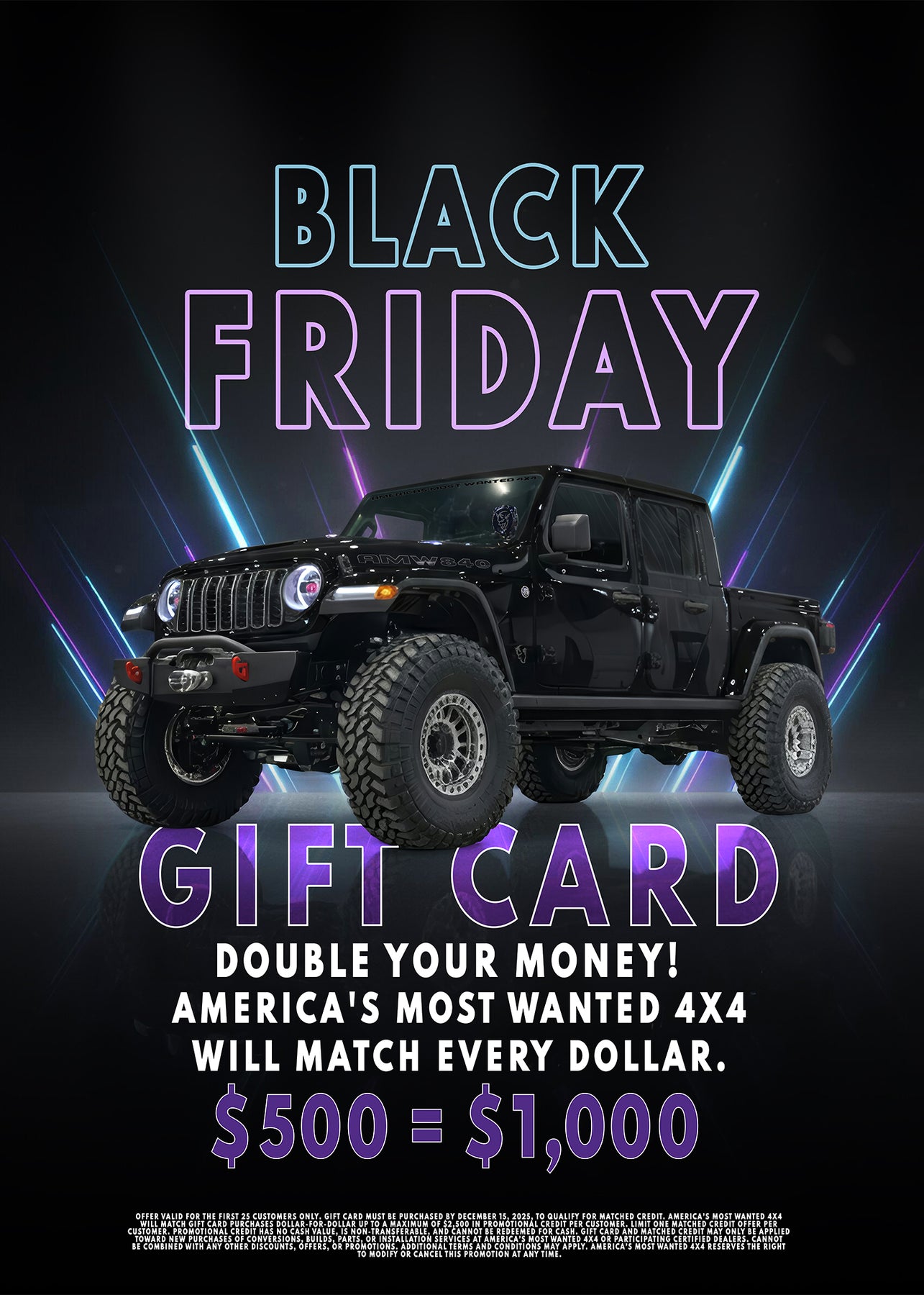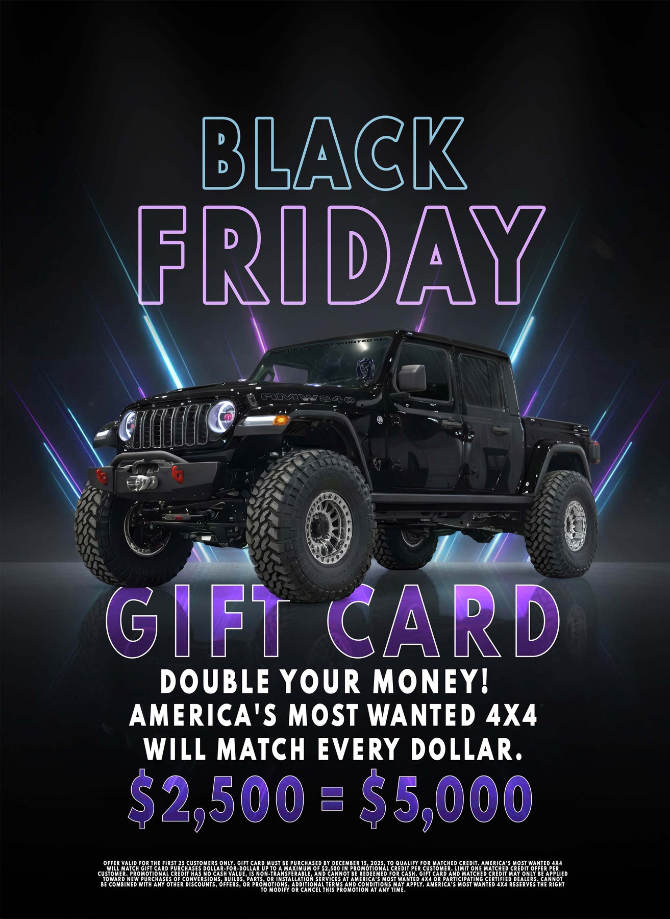 For the first time ever, America’s Most Wanted 4x4 is offering an exclusive Black Friday Gift Card Match Event. When you purchase a qualifying America’s Most Wanted 4x4 Gift Card, we’ll match every dollar you spend, up to an additional $2,500 in FREE credit.